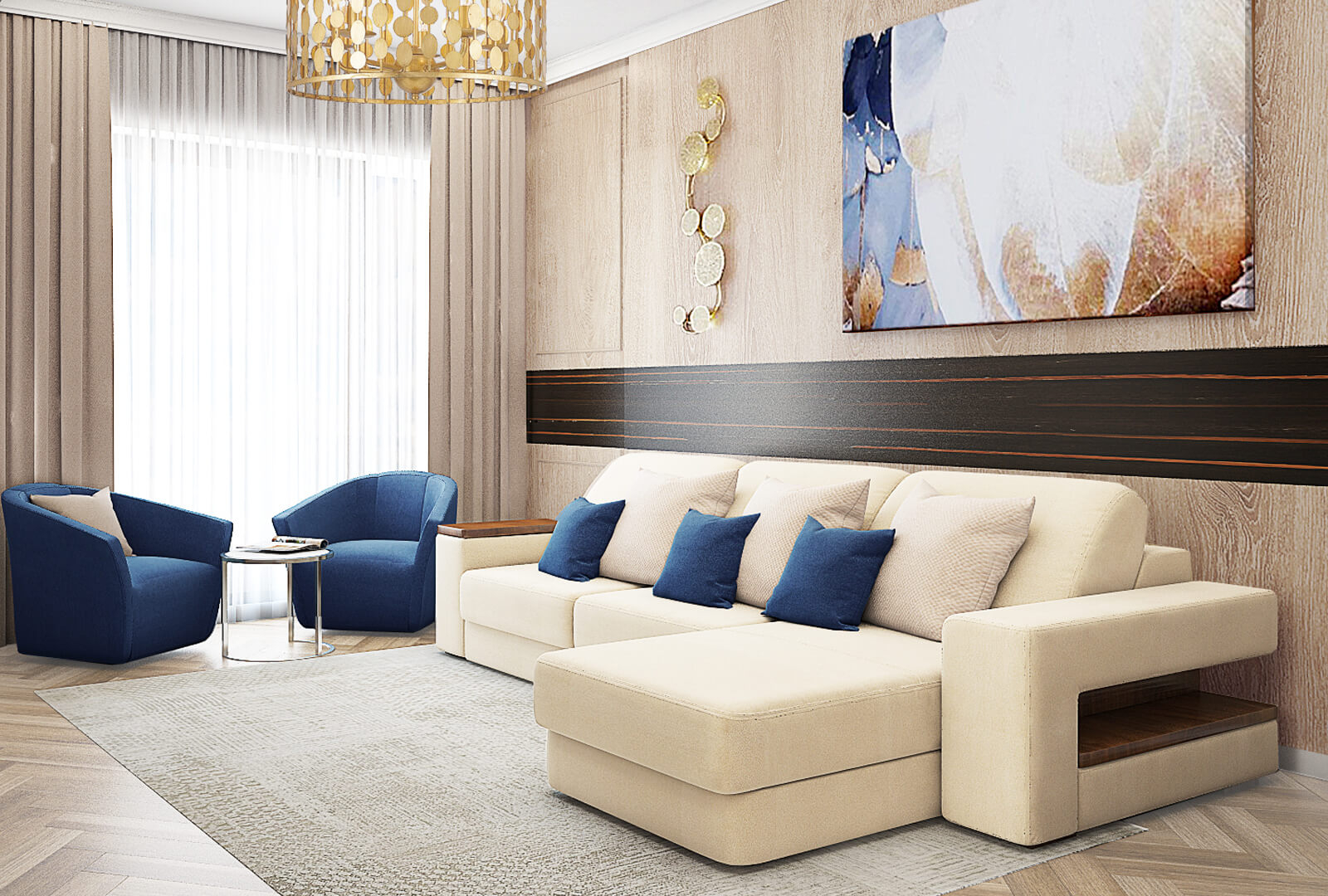 Спальня родителей обустроена так, что может стать полноценным местом уединения и отдыха за просмотром телевизора, а не только сна. Имеется даже мини-кухня-стенка Haus с отделкой фасадов «Ромб», как и в гостиной. Внутри и в нижней части подвесного шкафа сделана подсветка. Под телевизором секция из четырех фасадов, а выше – открытая подвесная полка. И опять контраст! Напротив «темной» зоны TV – большой диван для отдыха «EGO Solo» в светлой ткани «Гран При 09». Рядом с окном – эксклюзивные кресла привлекательного синего цвета. Визуально объединяют зону отдыха аксессуары в виде контрастных подушек.