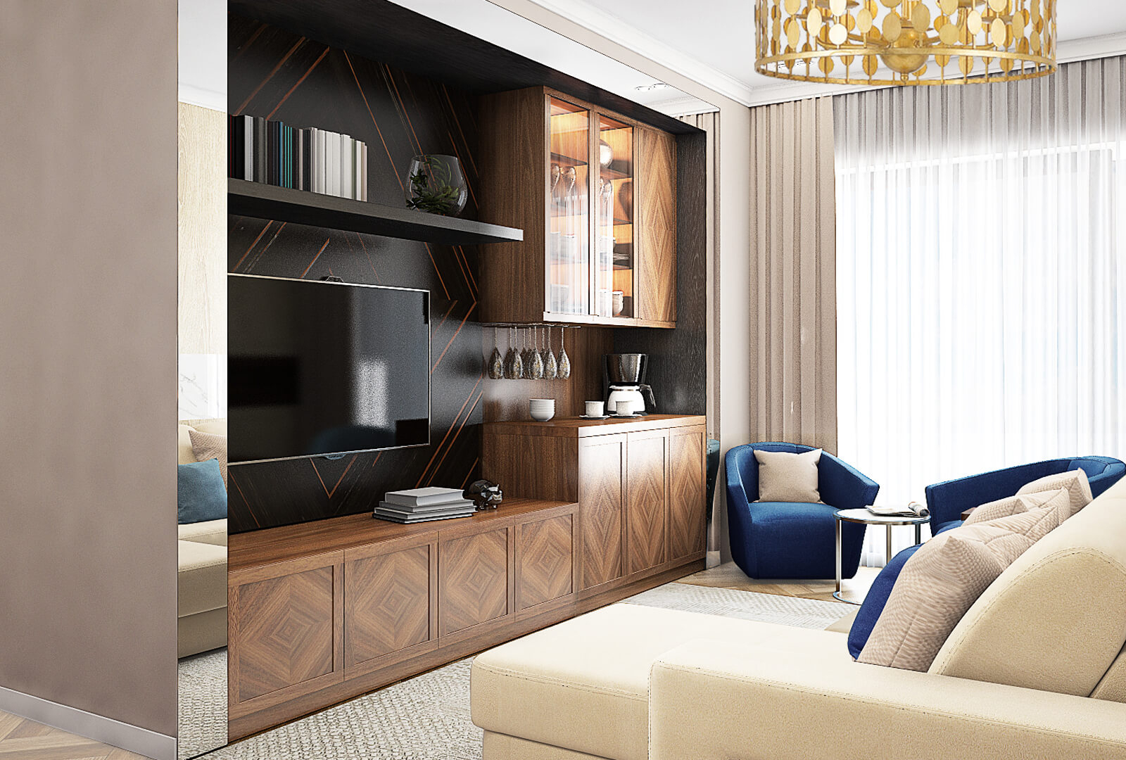 В гостиной нас встречает роскошный комплект мебели Haus с ромбовидной отделкой из шпона. С двух сторон от круглого обеденного стола расположены два буфета, одновременно разных и дополняющих друг друга за счет выбранного решения по чередованию стеклянных и деревянных дверок. В TV-зоне размещена композиция мебели Haus из длинной тумбы, подвесного шкафа и открытых полок. Сдержанная классика в темных тонах гармонично дополняет светлую зону с камином и телевизором.