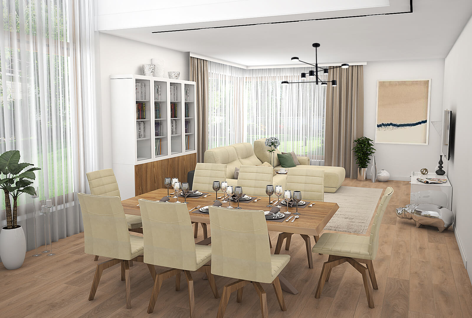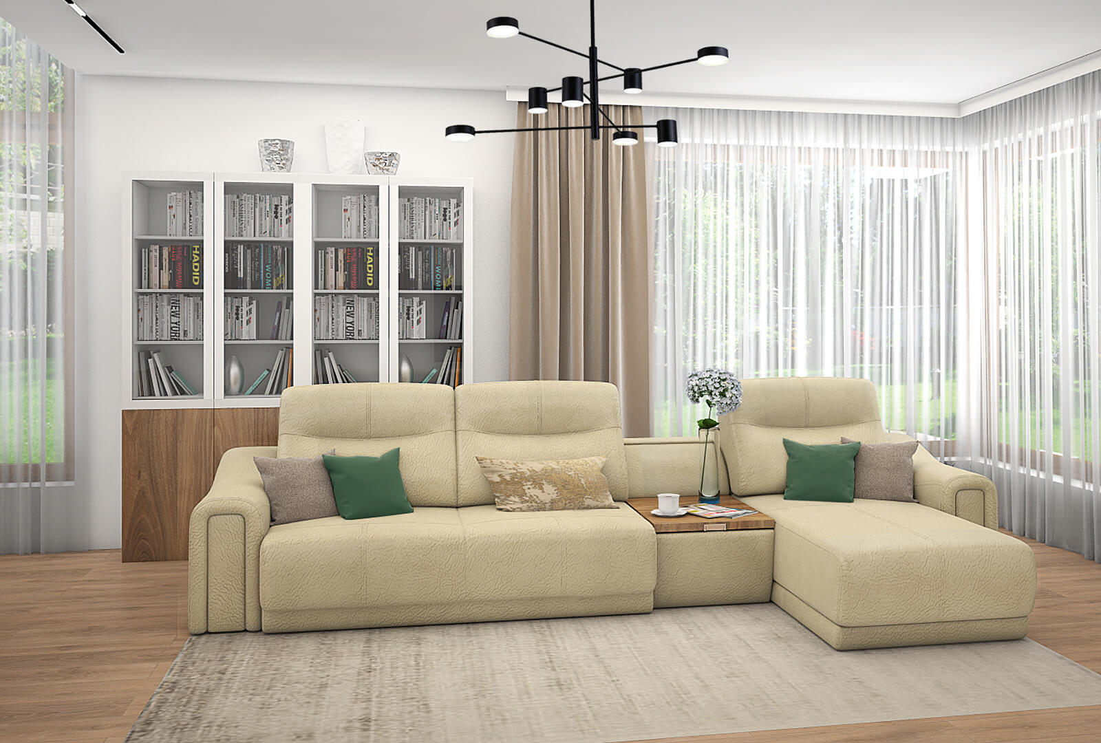 Дом – это место, где тебя ждут, куда хочется возвращаться, где находиться легко и приятно. Концепцию большого, наполненного воздухом, светлого пространства, где найдётся место для всех членов многочисленной семьи, и взял за основу дизайнер при разработке проекта этого дома площадью 250 кв.м. В зоне отдыха – большой диван Douglas в коже Sensation 32 цвета слоновой кости с декором из светлого ореха. Конструкция дивана располагает к комфортному времяпрепровождению за беседами, чтением книг или совместным просмотром телевизора. Цветовое решение поддерживается в обеденной зоне – стулья Leonardo отделаны той же кожей Sensation 32, что и диван, декор – американский орех матовый. Обеденный стол SHANGAI от итальянского бренда Riflessi может вместить за собой всех членов семьи, и даже гостям найдется место. Шикарное сочетание розового золота и массивной столешницы «под дуб» не оставит никого равнодушным.