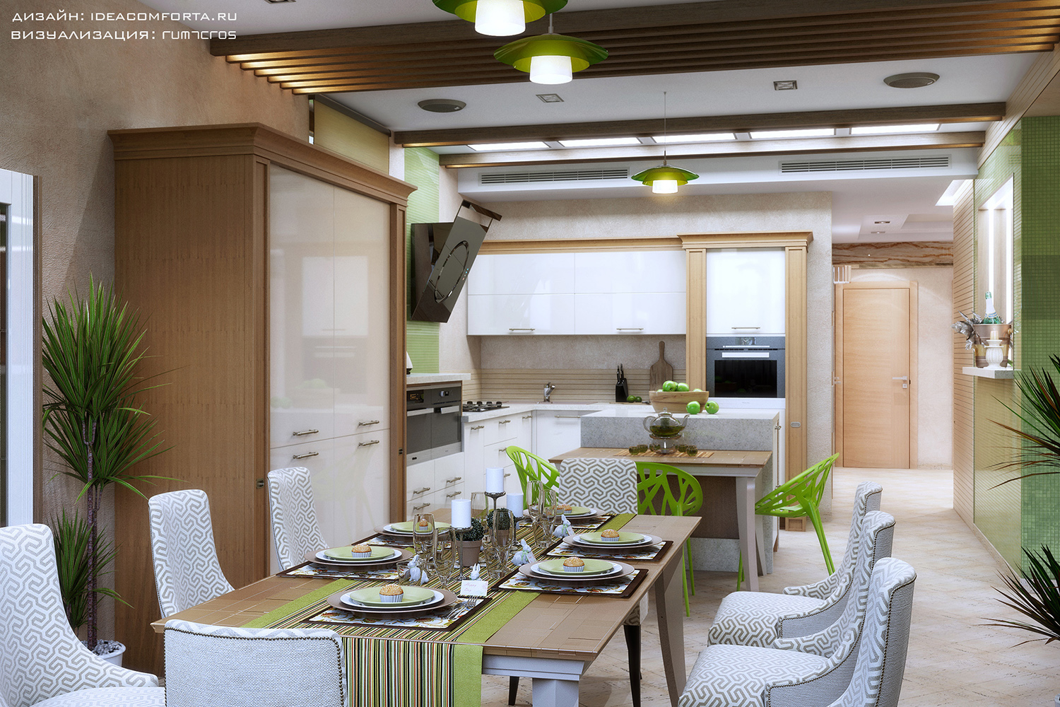 Согласно техническому заданию на проектирование, интерьер было решено оформлять в ЭКО-стиле, чтобы жить в единении и гармонии с природой, поэтому в отделке преимущественно применены различные породы дерева. В планировке мы использовали принцип треугольника: диван-камин-телевизор. Во главе композиции красавец-диван Brooklyn. Идея была в том, чтобы, не вставая с мягкого дивана, у Заказчиков была возможность наблюдать за тем, как горит огонь в камине, как прекрасна природа за окном, как готовятся на кухне любимые блюда. Также мы предусмотрели систему «Умного дома», которая управляет сценариями освещения, шторами, системой домашнего кинотеатра. Мы задались целью создать не просто гостиную, а настоящую зону релаксации, уюта и умиротворения, поэтому требования к «королю» гостиной — дивану были очень высоки!