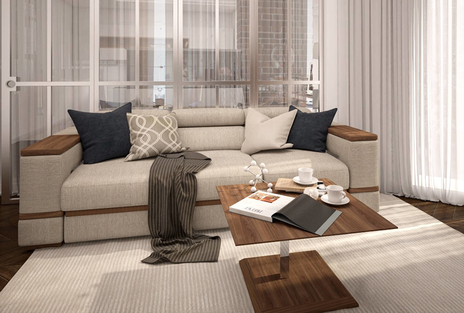 Диван Gio блестяще вписался в интерьер благодаря совершенной форме и оригинальной отделке, когда «рогожка» удачно сочетается с натуральным деревом.