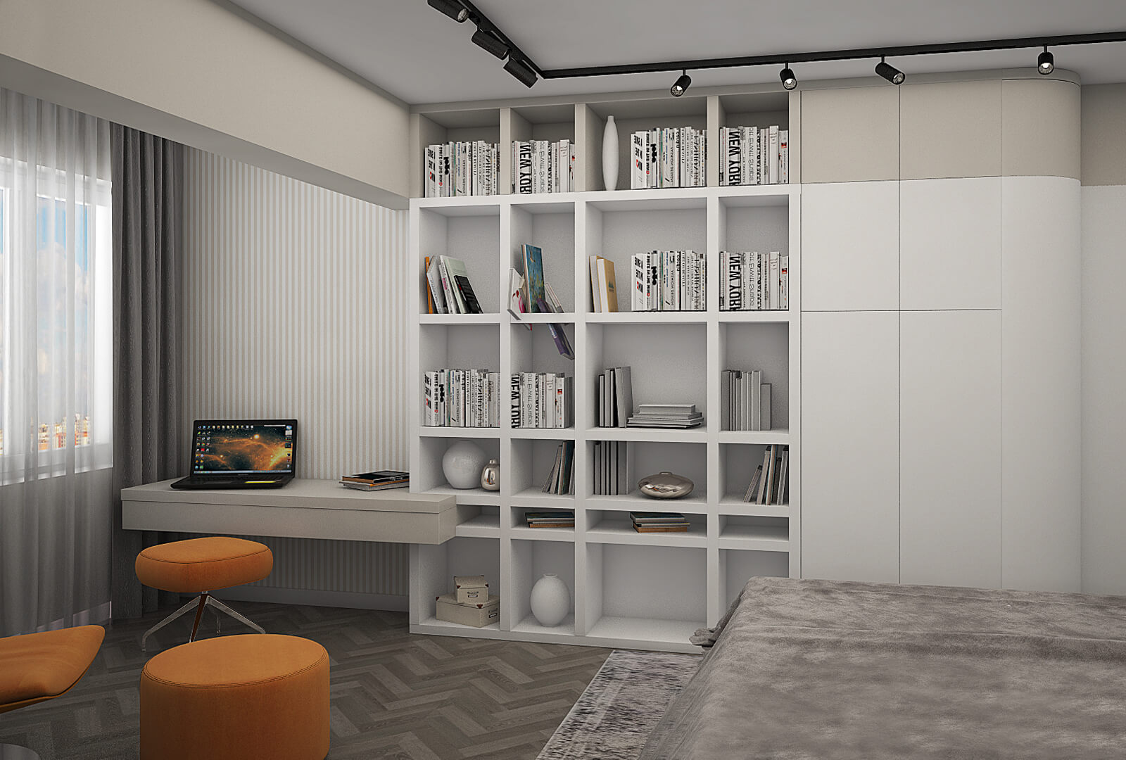 В рабочей зоне — стенка-шкаф с открытыми полками и встроенный в неё небольшой, но удобный стол из коллекции Haus. Для хранения вещей используется шкаф S-Line в тех же белых и нежно-бежевых цветах.