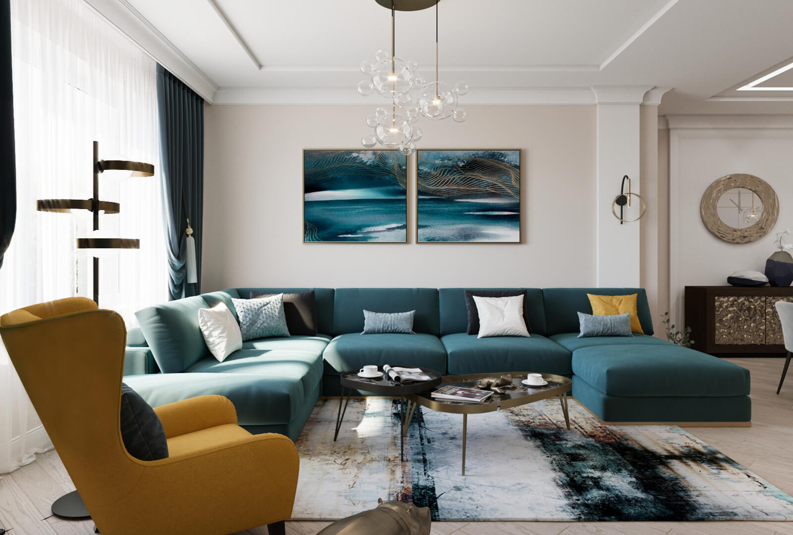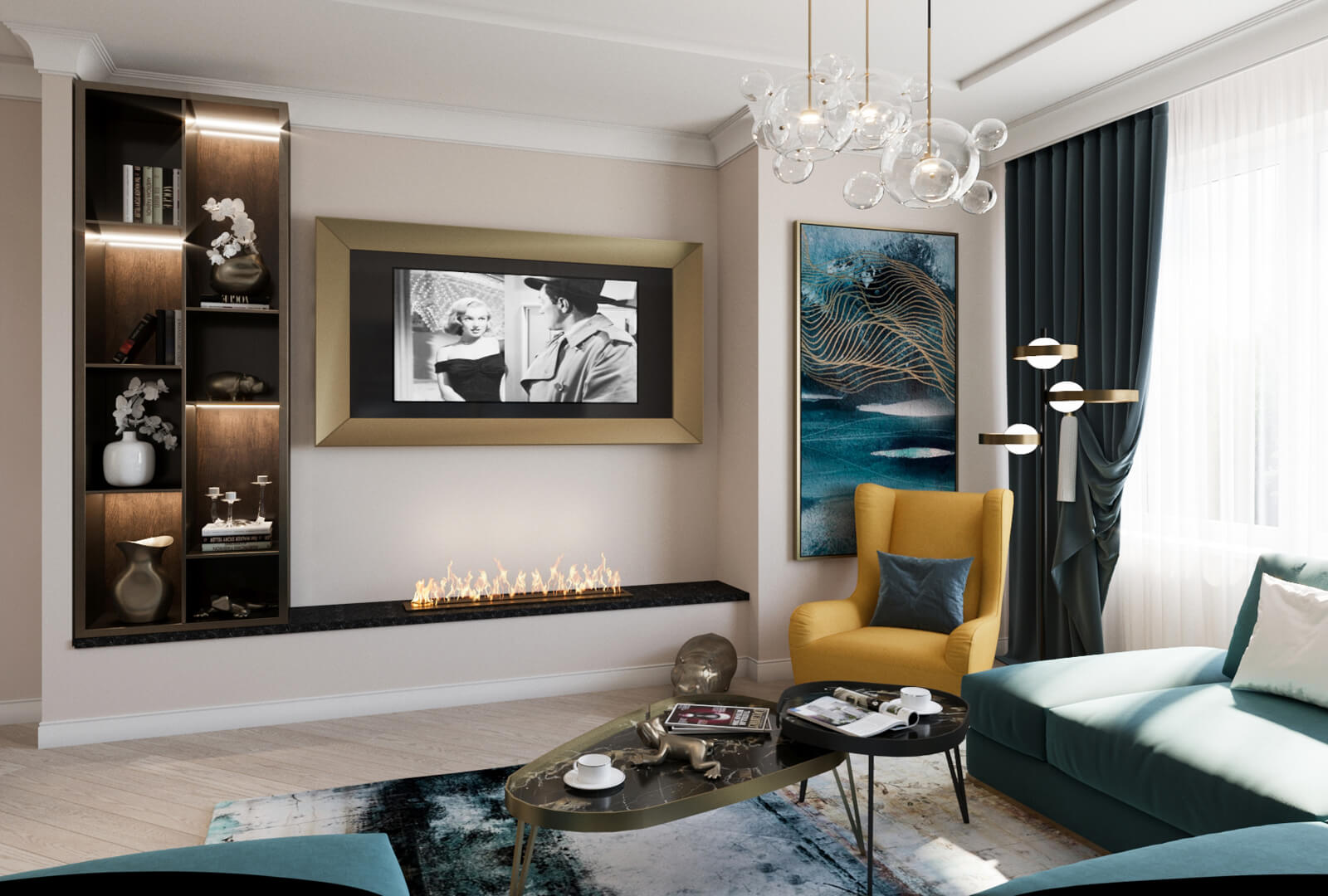 Можно ли создать в рамках квартиры настоящий райский уголок, который будет напоминать о солёном море и горячих песчаных пляжах? При разработке проекта кухни-гостиной дизайнер постарался это сделать. Диван Ontario от möbel&zeit в ткани цвета морской волны с яркими акцентами из разноцветных подушек — максимально комфортное место для расслабляющего отдыха в большой компании. Креативный журнальный столик Lumiere от Riflessi своей формой напоминает обкатанные морем камни, ощущение особенно усиливается на фоне ковра. Кресло Bergere сочного жёлтого, словно тропические фрукты, цвета приятно контрастирует с другой обстановкой помещения, особенно на фоне стильных панно от Adriani&Rossi. Ещё в интерьере можно заметить вазы Adriani&Rossi, впечатляющие разнообразием своих форм. TV-зона Haus Exclusive изготовлена по индивидуальному заказу и удачно вписана в геометрию комнаты. В зоне кухни предпочтение отдано неярким «песчаным» и золотым оттенкам. Большой обеденный стол Living от Riflessi окружён удобными стульями Sofia. Изюминка кухни — комод Picasso от Riflessi с фасадами Mito, искрящимися как вода под ярким солнечным светом.
