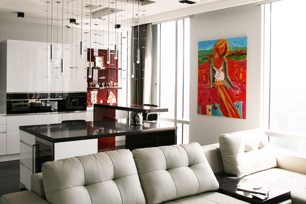 Новый Дом на Мосфильмовской стал для города очередным символом современной архитектуры. Что-то невообразимое по форме вдруг возникло рядом с классикой мосфильмовских павильонов. Высоченный молодой хозяин новой квартиры в Доме на Мосфильмовской так гармонировал своей силой характера с этим строением, что очень хотелось не нарушить это согласие и создать гармонию между экстерьером жилого дома, дизайном интерьера и внутренним миром хозяина. Так вот, в супер высотке на Мосфильмовской, по заданию хозяина, всего за 6 месяцев необходимо было придумать и воплотить интерьер, в котором можно принять иногда гостя для делового разговора за рюмочкой хорошего конька, а также расслабиться после рабочего дня, послушав диджейский микс на хорошем звуке. «Это не должно быть уютным семейным гнездышком, как у меня в доме», — отметил молодой бизнесмен. Для хай тека времени совсем не было, поэтому мы решили совместить мужскую строгость линий, блеск ночных клубов и яркий поп арт, встроив для комфорта технологичные решения для быта.