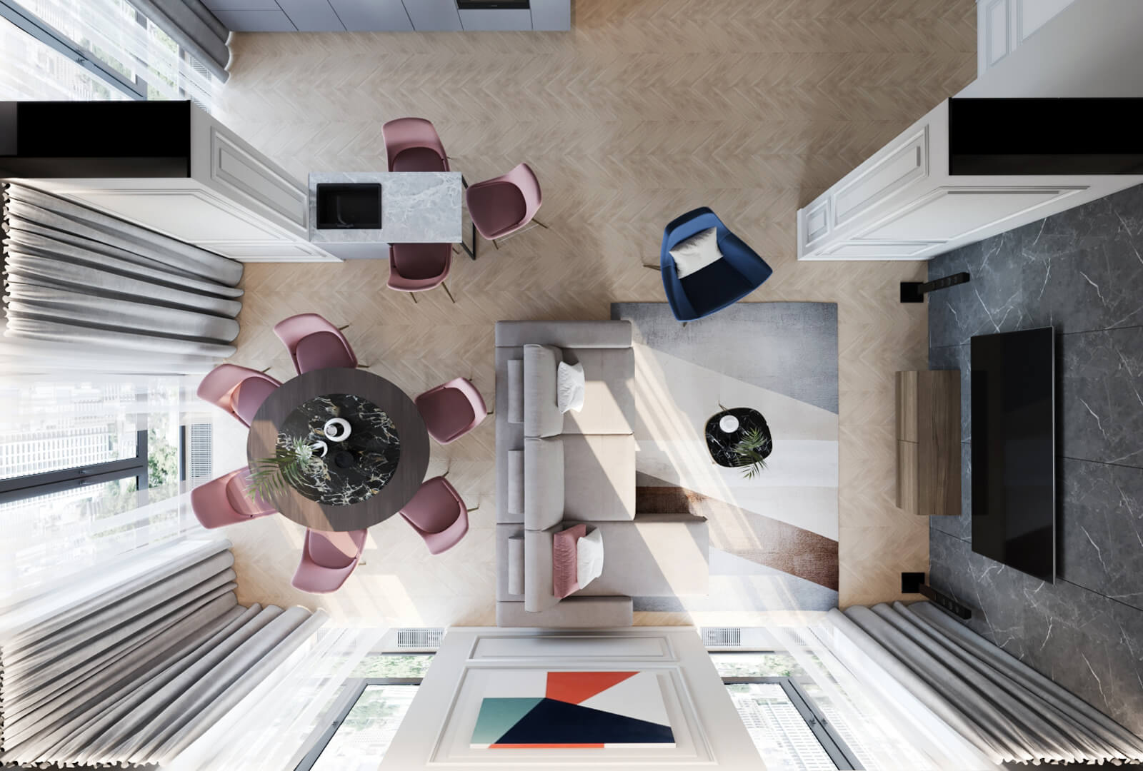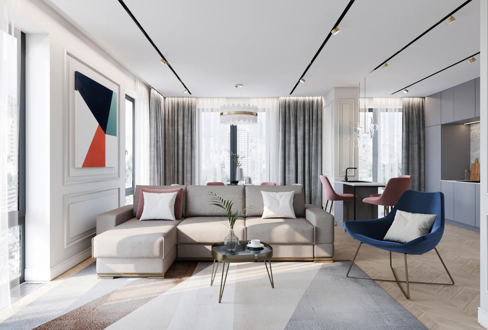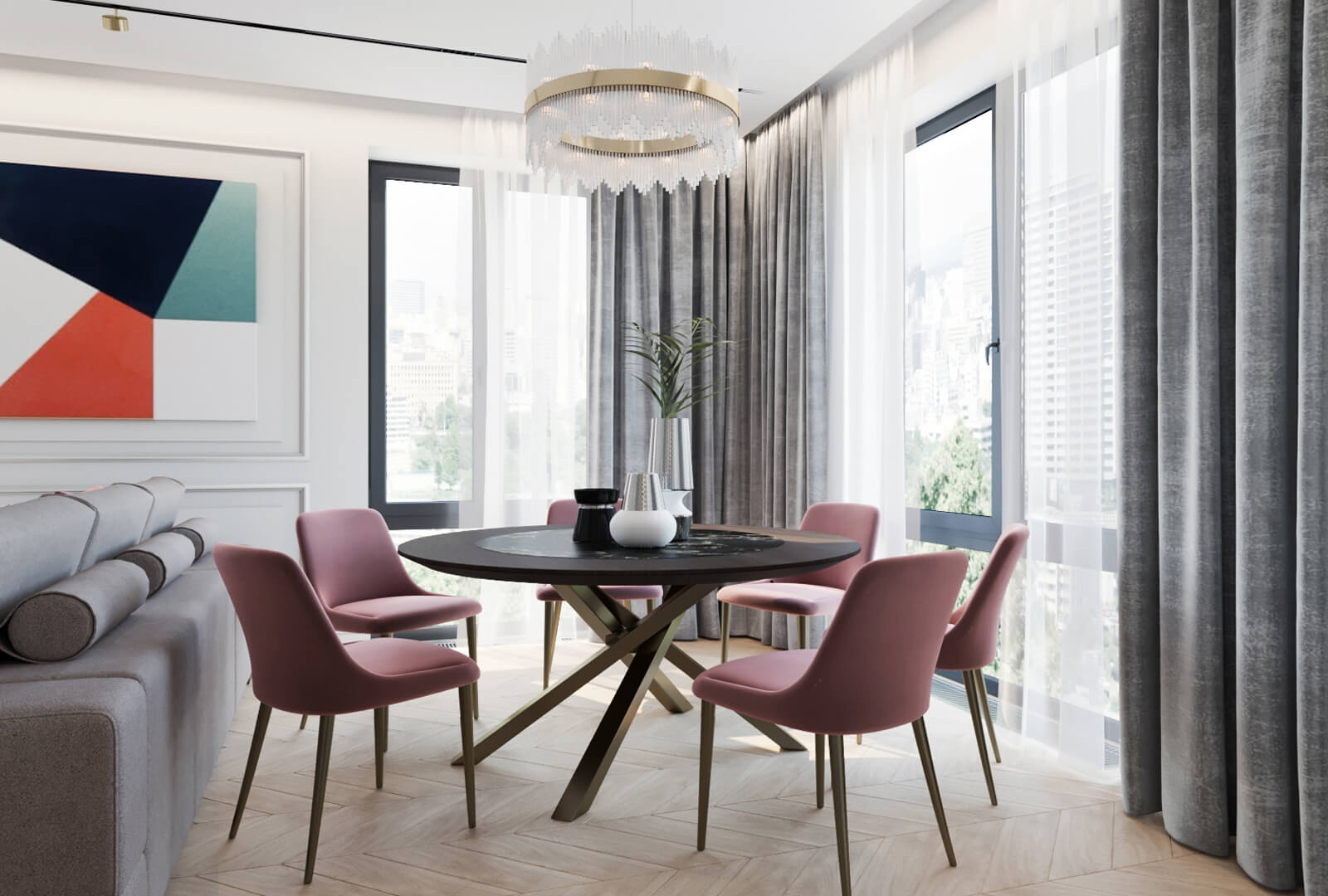 Этот дизайн-проект кухни-гостиной вдохновлён принципами абстракционизма, но цветовое решение выбрано преимущественно пастельное, без кричащих цветов. Также разработаны два варианта обеденной зоны – различные по вместимости и смелости дизайнерских решений. Кубические формы дивана Garda от möbel&zeit подчёркнуты эксклюзивными декоративными защипами на боковых гранях оттоманки, но за строгостью перпендикулярных линий скрываются декоративные валики, расположенные позади спинок сидений. Узор ковра Adriani&Rossi с наклонными полосами серо-коричневых оттенков придаёт динамику зоне отдыха. Комфортное кресло-крыло York от Riflessi служит ярким цветовым акцентом и за счёт креативной формы металлических ножек гармонирует с небольшим журнальным столиком Lumiere. Компактная TV-зона Haus Exclusive от möbel&zeit выполнена из светлого дерева – это работа по индивидуальному эскизу, созданному на основе пожеланий заказчиков. Для первого варианта обеденной зоны подобран стол Shangai от Riflessi со столешницей с декоративной вставкой «под камень» и необычными наклонными пересекающимися ножками. Стулья Sofia от Riflessi припыленно-розового цвета здесь в дизайне без подлокотников. В этом варианте получилось создать достаточно вместительное пространство для целой компании. Второй, более миниатюрный, пример обеденной зоны укомплектован классическим по дизайну круглым столом Zed от Riflessi. Стулья здесь также Sofia, но уже в вариации с подлокотниками. Несмотря на видимую разницу в настроениях и вместительности этих обеденных зон, в обоих случаях для украшения использованы стильные дизайнерские вазы от Adriani&Rossi.