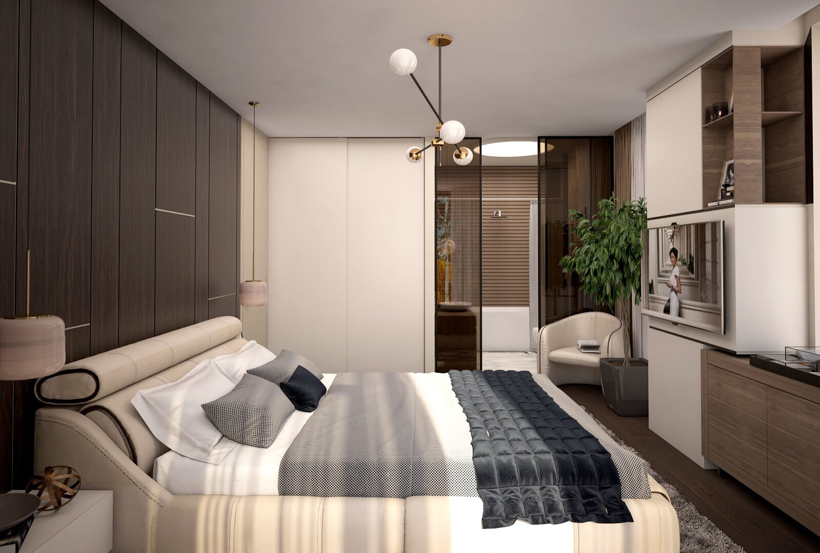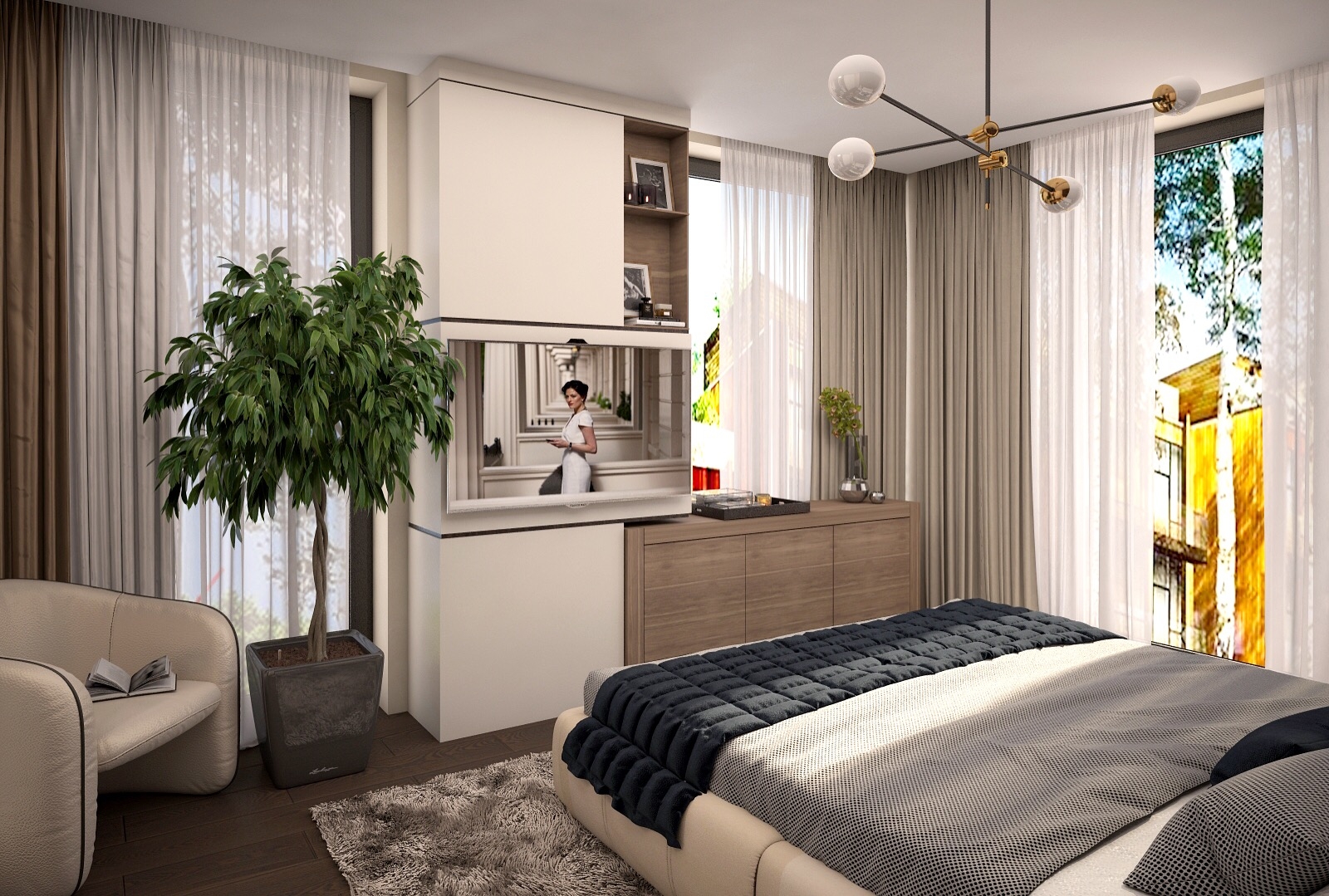 Хозяева спальни — супружеская пара — мечтали о современной спальне, но которая бы не отталкивала идеальными пропорциями и витринной холодностью.