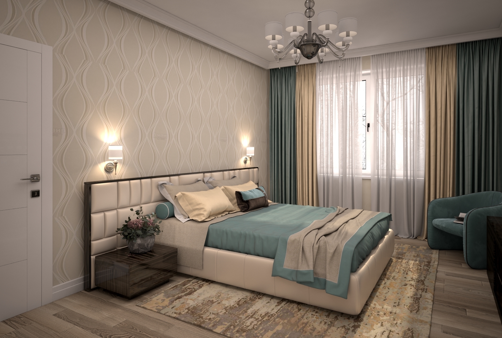 Композиция не получилась бы столь гармоничной без деталей насыщенного оттенка а-ля Tiffany. Они привносят в спальню спокойную, умиротворяющую атмосферу, когда хочется погрузиться в мечты и приятные размышления.