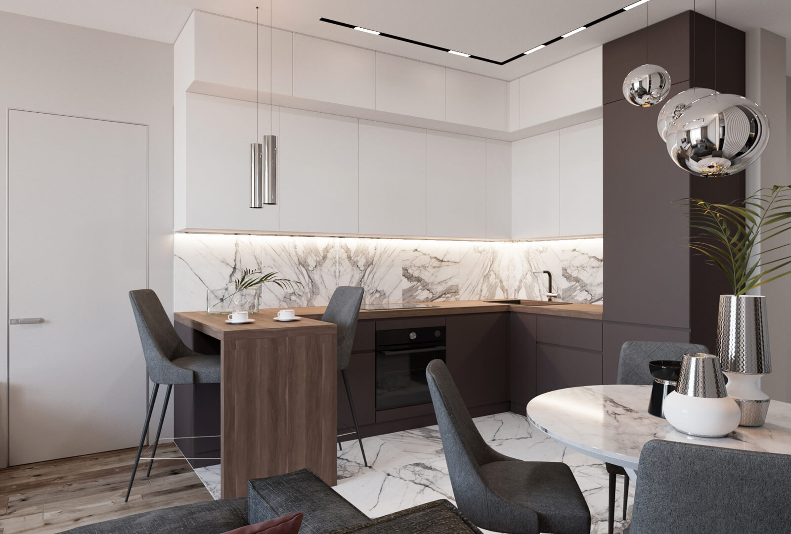 Настроение общей гостиной задает темно-графитовый диван Spensor Bordo от Atelier Tessuto, комфортный и достаточно большой, чтобы вместить всю семью. В зоне отдыха также расположены практичная ТВ-тумба и оригинальные подвесные полки Leonardo Cube.