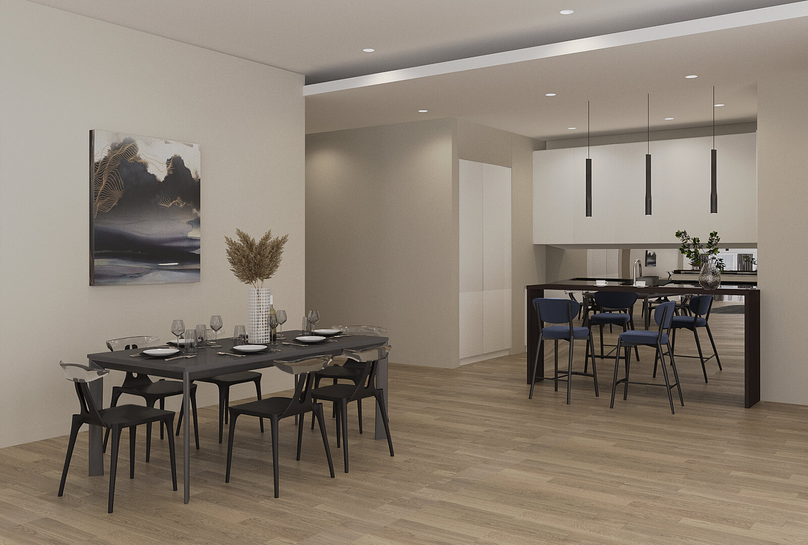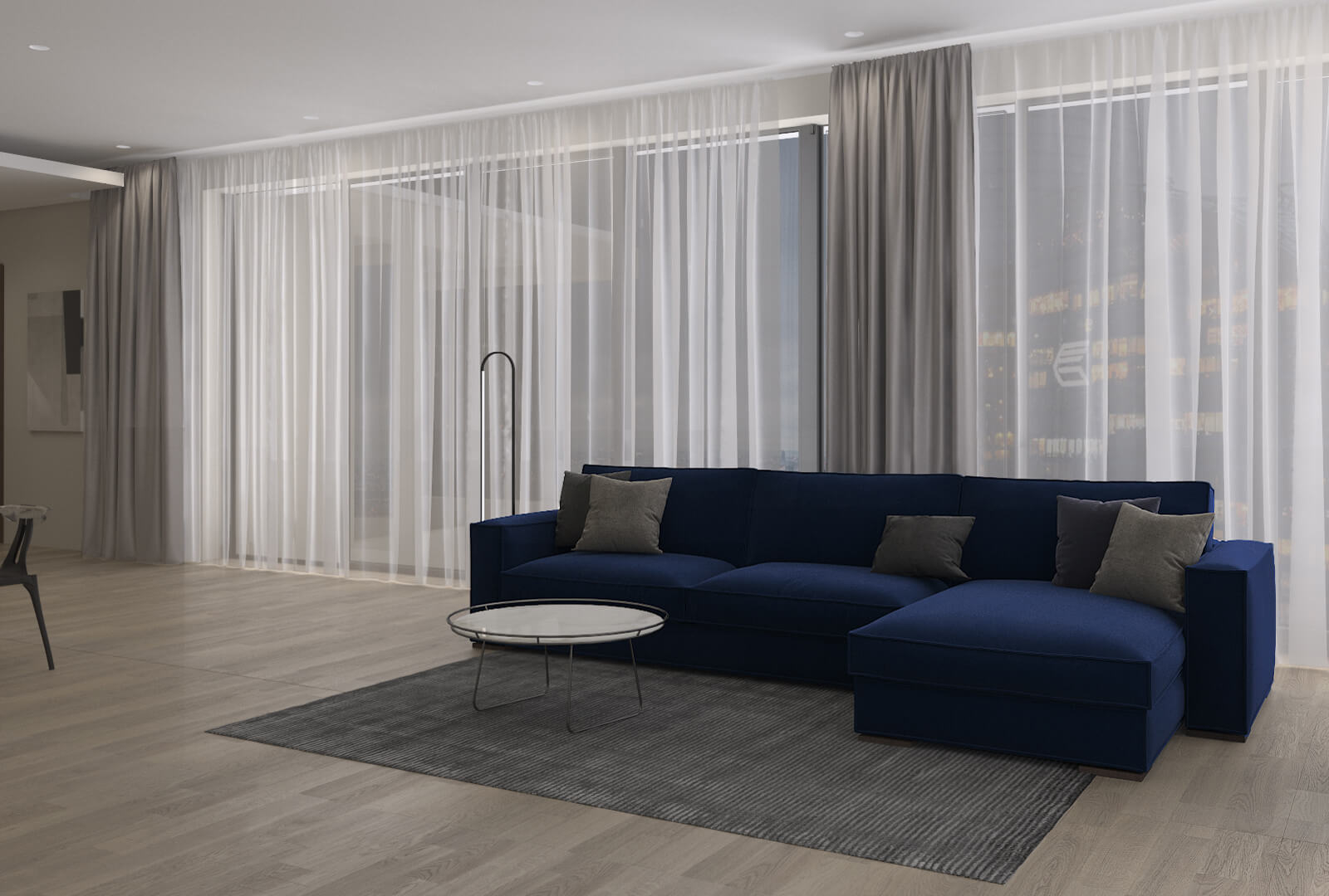 Речь, конечно же, про центр гостиной – диван Grande Bordo в ткани глубокого благородного синего цвета. Он же используется в отделке барных стульев Madrassi Teddy. Цветовые пятна балансируют помещение, оформленное в различных оттенках серой гаммы. Диван дополняют журнальный столик Madrassi необычной формы и фактурный ковер Adriani Rossi. Обеденная группа состоит из стола Riflessi Manhattan и стульев Madrassi Fly, выполненных в темном дереве. Декоративные аксессуары, картины и креативный торшер также от Adriani Rossi.